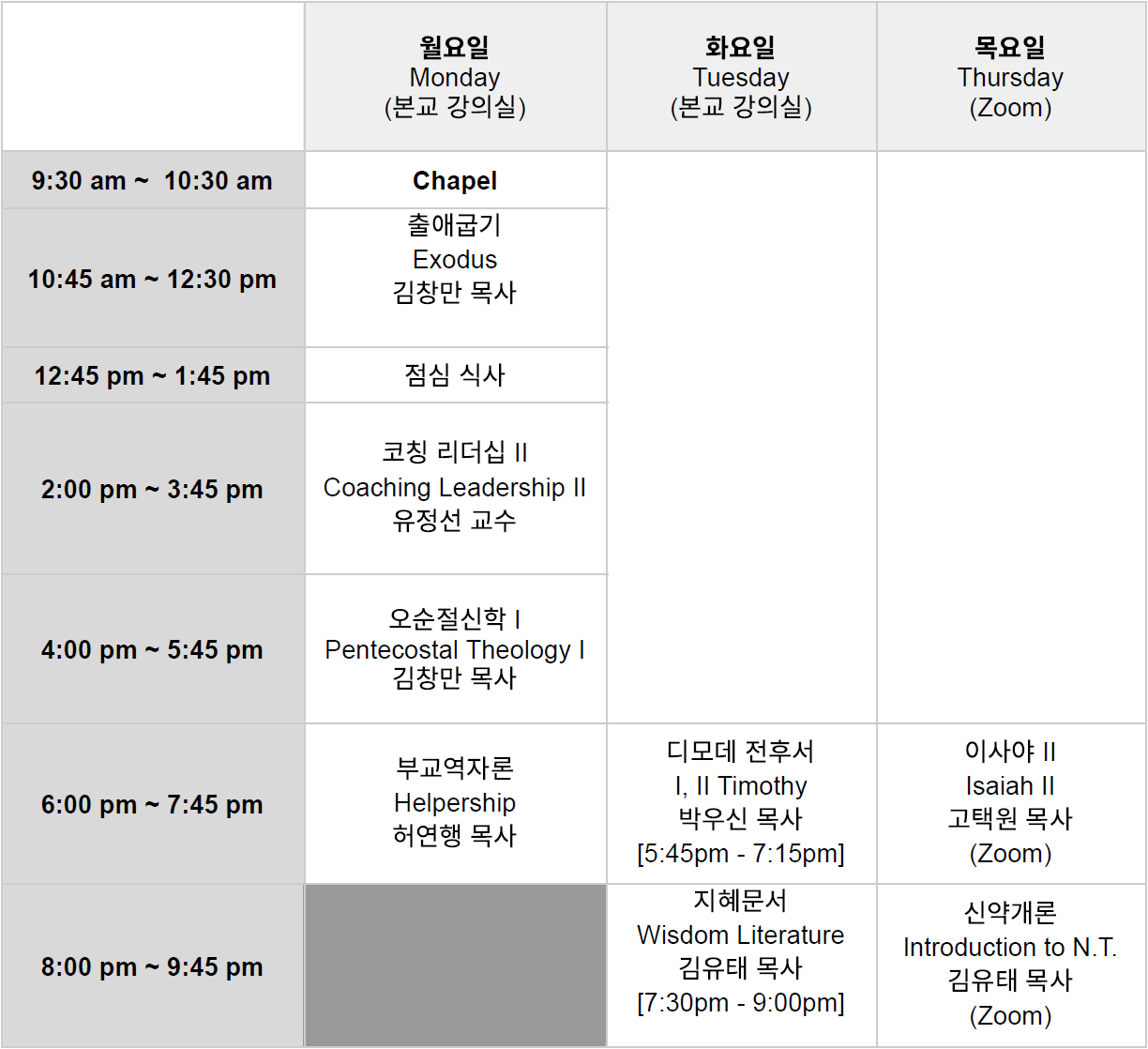 강의 스케줄 강의 기간: 1/26 (월) - 5/21 (목)재학생은 월요일 Chapel과 해당 Book Club에 모두 참석해야 합니다모든 강의는 본교 Classs에서 대면으로 진행합니다. 이사야 II, 신약개론 강의는 Online (Zoom) 으로 진행합니다. 2026년 봄 학기 강의 스케줄 2026년 봄 학기 강의 스케줄 Download 가을 학기 2025년 봄 학기 2024년 가을 학기 봄 학기 가을 학기 2023년 봄 학기 가을 학기 2022년 봄 학기 2021년 봄 학기 2020년 가을 학기 가을 학기 봄 학기